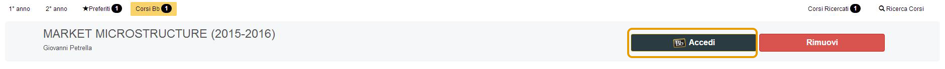 Troverai il corso e tutte le informazioni nella sezione CORSI RICERCATI. Se per l’insegnamento selezionato è presente almeno un corso Blackboard attivo, troverai il pulsante Bb Accedi. Segui le indicazioni riportate sopra.